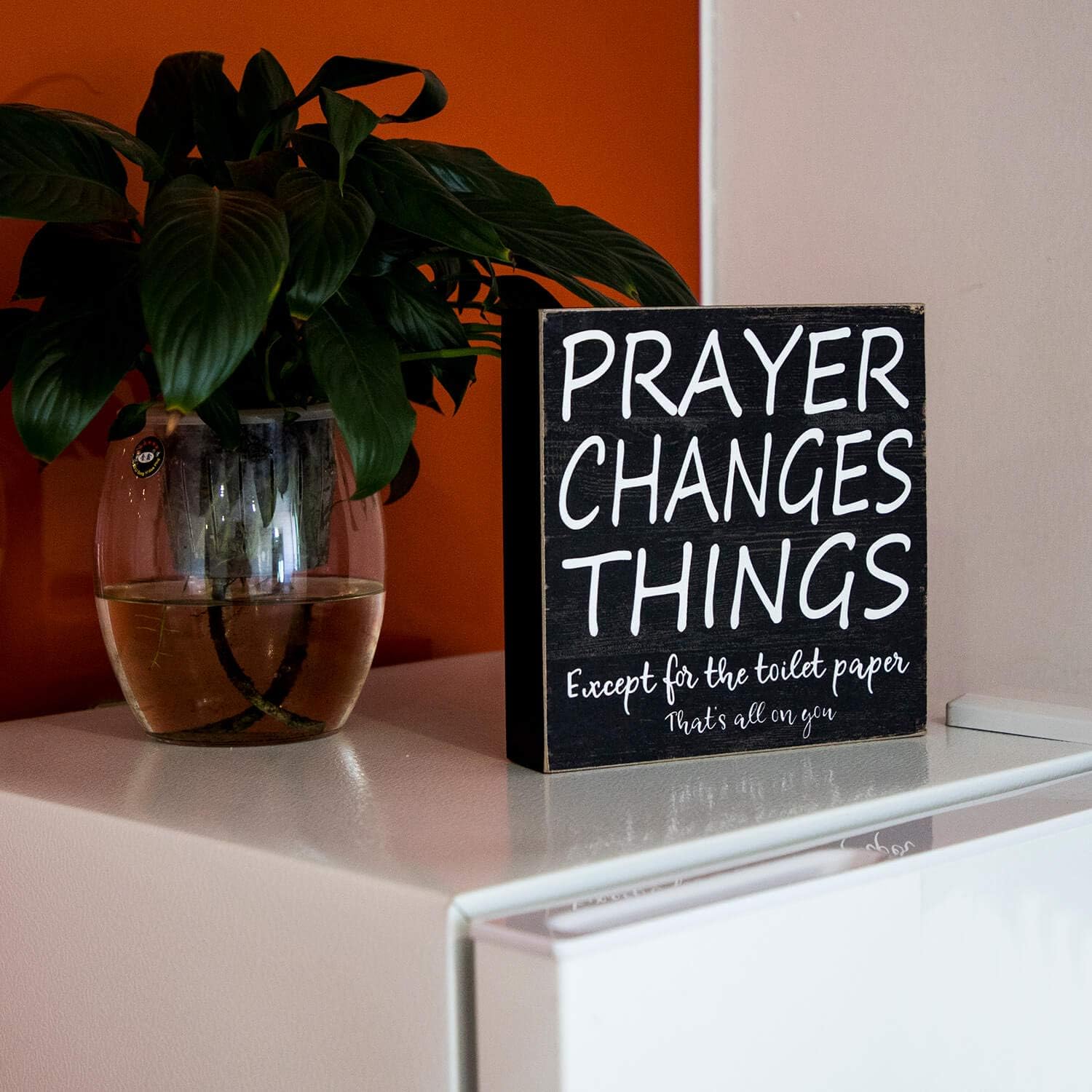 A creative home decor accent piece by Yankario, features classic box sign design with simple yet true and useful phrase in daily life “Prayer changes things except for toilet paper, that’s all on you.”