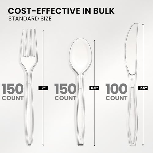 Specification: 400 Count Heavy Duty Plastic Silverware, BPA-Free, Clear Plastic Cutlery Set, Premium Disposable Utensils for Party Everyday Use, 150 Forks, 150 Spoons and 100 Knives