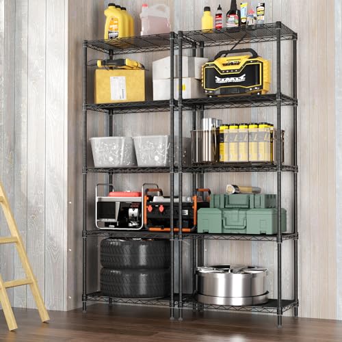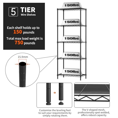 5 Tier Adjustable Storage Shelves Heavy Duty Metal Utility Shelf 750LBS Capacity Wire Shelving Unit Organizer Rack for Home Kitchen Office Bathroom Pantry Room 12″ D x 22″ W x 59″ H Black