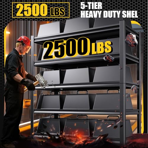 【Space Utilization Master】This 5-tier garage shelving supports freely adjustable shelf heights, with precise adjustment holes every 1.5 inches to accommodate storage of items of various sizes. Whether it’s small parts boxes, medium-sized storage boxes, or large tires and toolboxes, you can organize them in layers according to your needs, fully unleashing the potential of spaces such as garages and warehouses, and transforming cluttered items into tidy order in an instant.