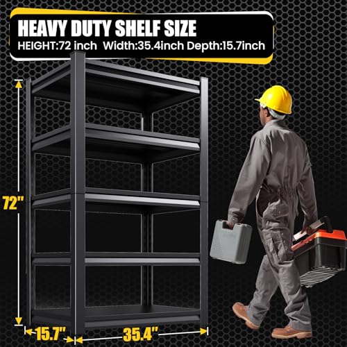 Specification: 5-Tier Garage Shelving Heavy Duty, Adjustable Metal Shelving Unit, 2500LBS Garage Storage Shelves, Easy Assembly Steel Shelving, Utility Storage Rack Shelf for Warehouse, 72”H*35.4”W*16”D