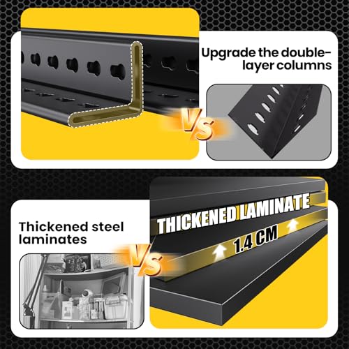 【Super Strong Load-Bearing Benchmark】The garage shelving uses a thickened cold-rolled steel “double-layer” frame design with a column width of 2 inches, combined with precision welding technology to create a sturdy metal shelves. Tested by authoritative institutions, this heavy-duty garage shelving far exceeds similar products in load-bearing capacity, with a single shelving unit capable of supporting up to 2500 pounds. This metal storage shelves can easily bears heavy loads like industrial equipment and full crates of goods, effectively preventing risks of displacement and deformation.