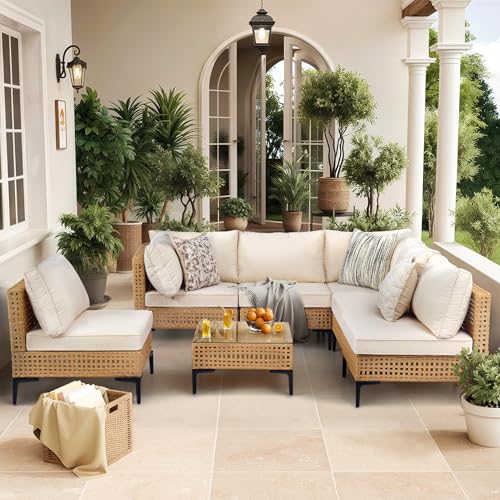 Specification: ABCASA Patio Furniture Set, 110″ Large 7-Piece Wicker Outdoor Patio Furniture Sets with Coffee Table,Boho Patio Conversation Set Sectional Sofa with All-Weather Cushions for Backyard,Porch,Beige