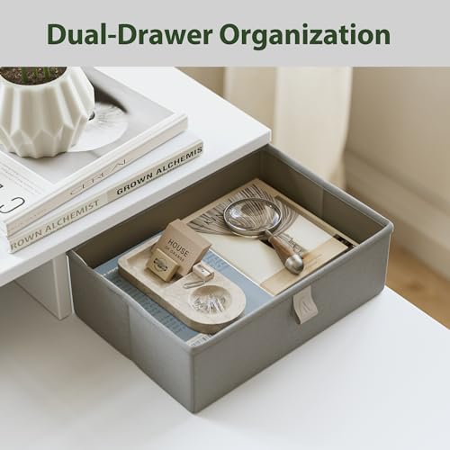 【2 Fabric Drawers】The 2 fabric drawers above the desktop can organize your clutter and keep the desktop clean and tidy all the time. The tabletop is made from low-VOC materials and meets federal and state protected air standards.
