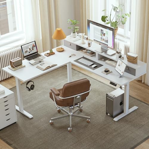 Specification: Agilestic L Shaped Electric Standing Desk with 2 Drawers, 63 Inch Ergonomic Adjustable Height Desk with Storage, Corner Desk Sit Stand up Computer Table for Work Office Home, White