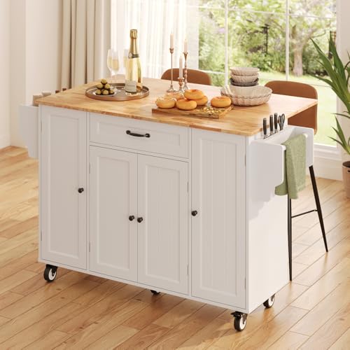 Ahomly Kitchen Island with Storage, 47.6″ Rolling Kitchen Island on Wheels with Drop Leaf, Door Cabinet, Drawer, Spice Rack, Towel Rack and Knife Holder, Kitchen Cart Island Table for Kitchen, White