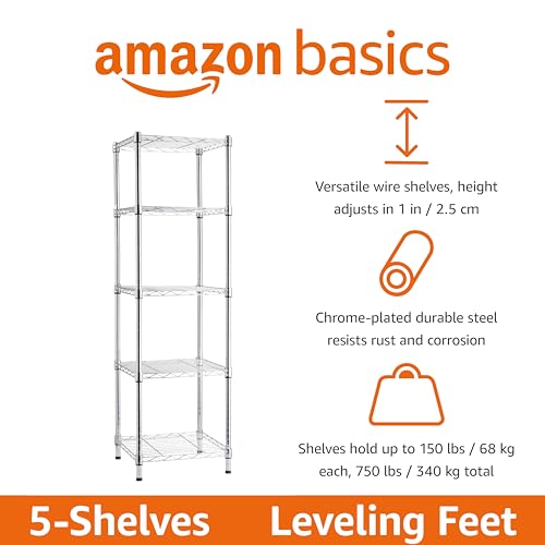 Specification: Amazon Basics 5-Shelf Tower Adjustable Storage Shelving Unit, Chrome, 16 D x 16 W x 54 H in