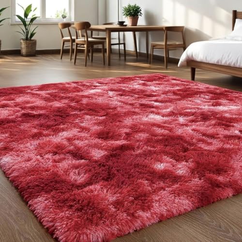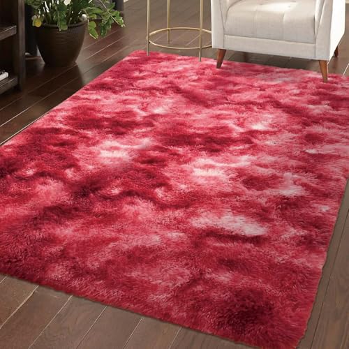 Cozy Winter Area Rug 6×9,Ultra Soft Plush Shaggy Rug Non Slip for Living Room/Bedroom,Kid/Pet Friendly,Modern Home Decor Carpet,Tie-Dye Midnight Red