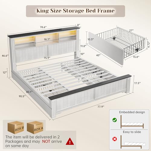 EnHomee King Size Bed Frame and Headboard & Storage, 4 Drawers and LED Built in Charging Station King Bed Frame with Storage Farmhouse,NO Noise,No Box Spring Needed,White