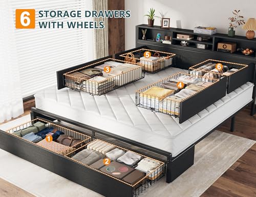 【6 Storage Drawers Black King Size Bed Frame with Storage】With a total load capacity of 132 lbs,6 large storage drawers can hold 200 T-shirts, 100 pants,drawers underneath the bed which add at least 75% more storage space. Each drawer is equipped with 4 smooth wheels for easy sliding in and out.Fixed holes on the bed frame king size which you can easily secure drawers to the bottom of the bed.Ideal for master bedrooms, guest bedrooms, apartments, and dorms.