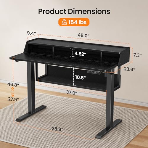 Storage & Organization: Designed with a top monitor shelf, storage cubicle, and a spacious bottom shelf (37″W × 10.5″H × 8.6″D), this electric standing desk provides ample space for your printer, books, and other office essentials.