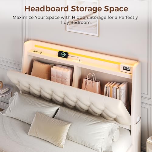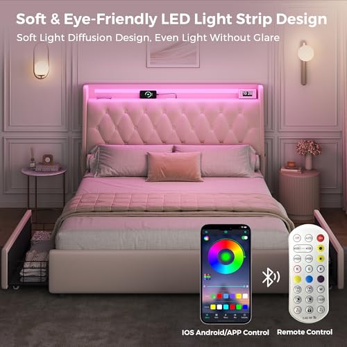 Specification: Full LED Velvet Bed Frame with 2 Storage Drawers&Hidden Headboard, Upholstered Platform Bed with Charging Station&Button Tufted Design, Wooden Slats Support, Box Spring Optional, Easy Assembly, Beige