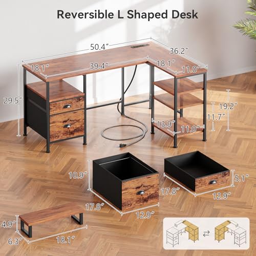 Furologee L Shaped Computer Desk with Power Outlet, Reversible Home Office Desk for Work Study, 50 Inch Corner Gaming Table with File Drawer, Monitor Stand, Storage Shelves, Rustic Brown