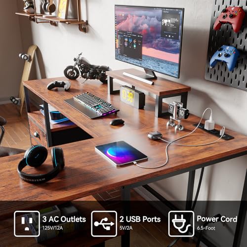 Specification: Furologee L Shaped Computer Desk with Power Outlet, Reversible Home Office Desk for Work Study, 50 Inch Corner Gaming Table with File Drawer, Monitor Stand, Storage Shelves, Rustic Brown