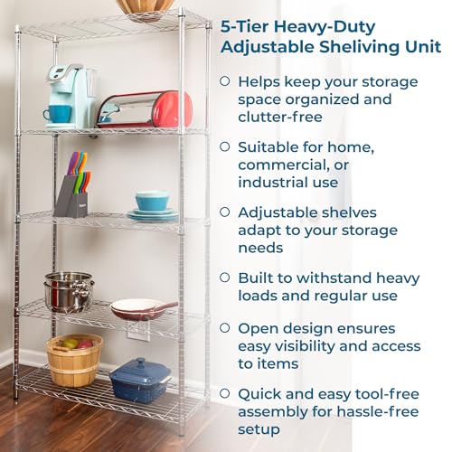 Honey-Can-Do 5-Tier Heavy Duty Adjustable Shelves, Metal Storage Rack with 200-lb Shelf Capacity, Chrome, 14″ W x 36″ L x 72″ H