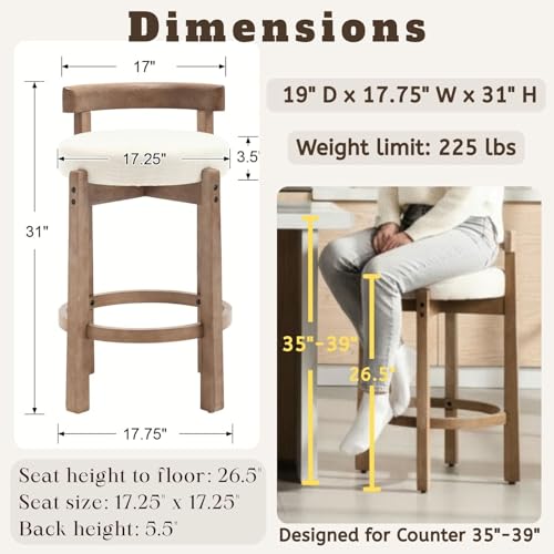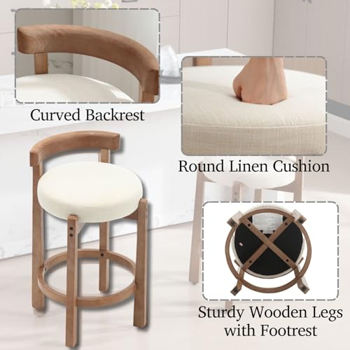 Specification: LukeAlon Mid Century Linen Counter Stools Set of 3, Upholstered 26.5″ Seat Height Low Barstools with Natural Wood Legs Round Low Back Kitchen Stools with Footrest for Dining Room, Beige