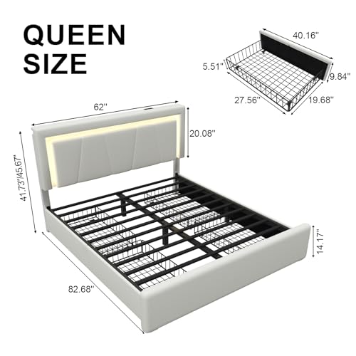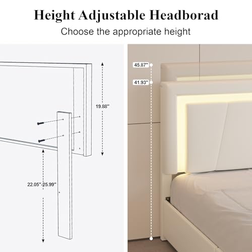 Specification: Queen Size Bed Frame with 4 Storage Drawers and LED Lights, Upholstered Platform Bed with Adjustable Headboard and Charging Station, Metal Slats Support, No Box Spring Needed,Easy Assembly, White