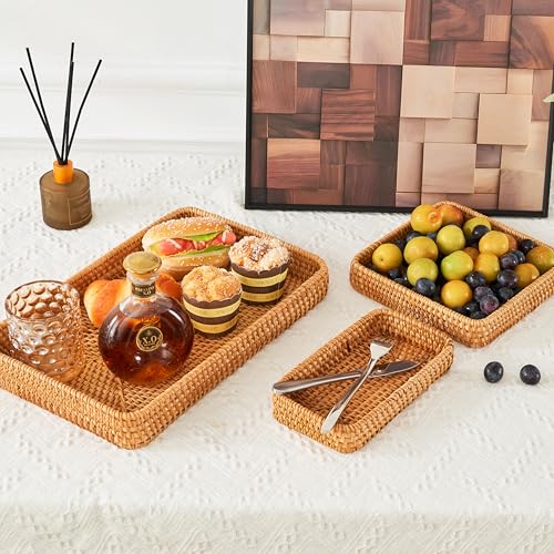 Rattan Tray Set of 3, Rectangular Woven Wicker Tray, Natural Wicker Rattan Serving Baskets for Table Kitchen Bathroom Counter Organizing