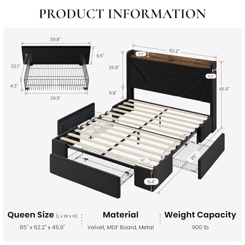 Specification: SHA CERLIN Queen Bed Frame with 3 Drawers, USB & Type-C Charging Ports, Velvet Upholstered Platform Bed with Modern Geometric Wingback Storage Headboard, No Box Spring Needed, Easy Assembly, Black