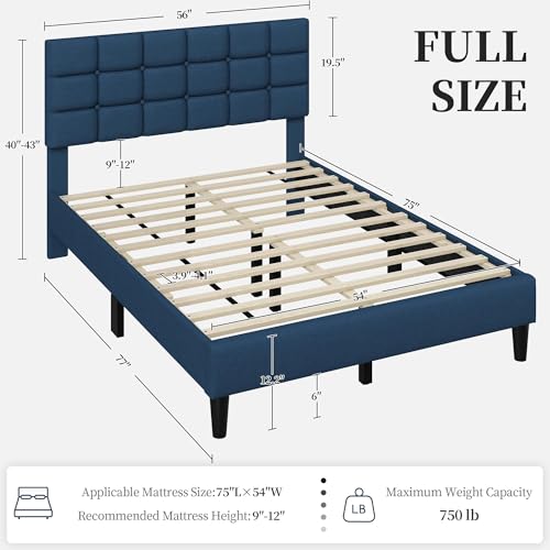 Specification: Yaheetech Upholstered Bed Frame, Modern Full Bed Platform with Square Stitched&Button Tufting Headboard Height Adjustable, Wooden Slats Support, No Box Spring Needed, Full Size, Navy Blue