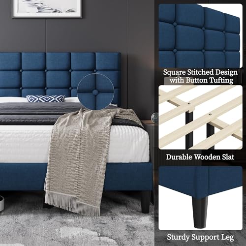 Yaheetech Upholstered Bed Frame, Modern Full Bed Platform with Square Stitched&Button Tufting Headboard Height Adjustable, Wooden Slats Support, No Box Spring Needed, Full Size, Navy Blue